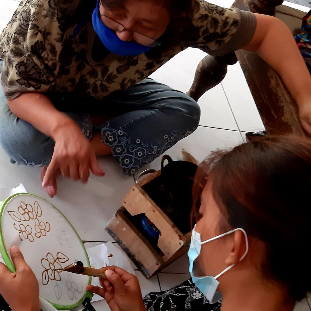 Sepertinya proses dasar lilin batik yang dikerjakan oleh anak didiknya tidak rapi-rapi amat, tapi kata-kata cela tak keluar dari mulut sang instruktur.